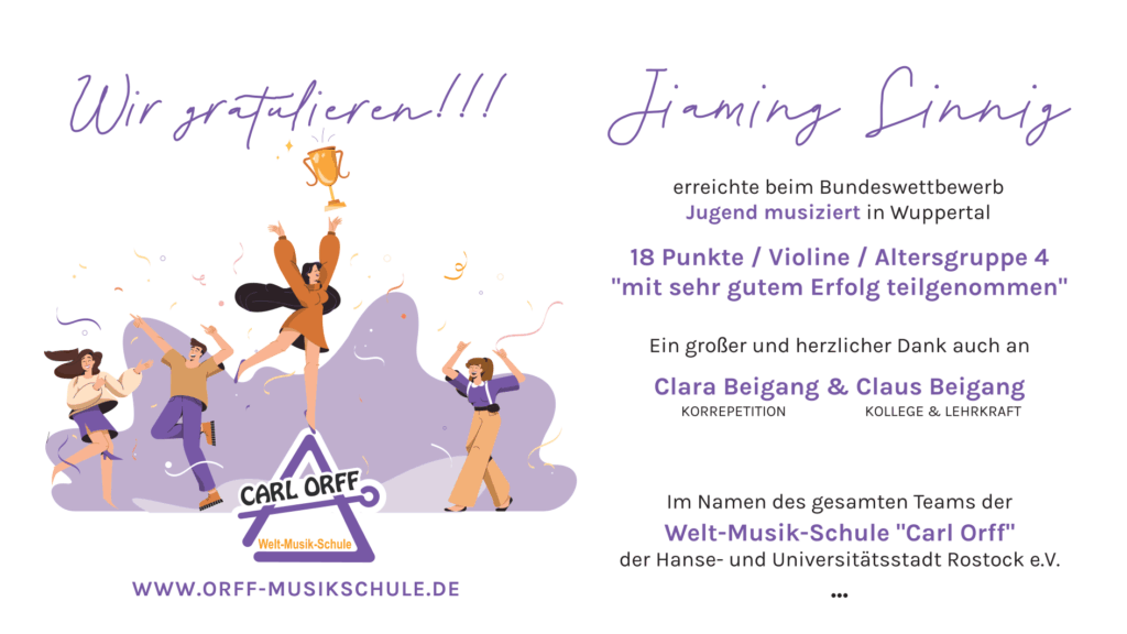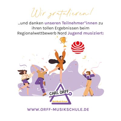 Wir freuen uns mit den teilenhmenden Schüler*innen der Orff-Musikschule und sagen herzlichen Glückwunsch. Ein großes Dankeschön geht auch an die Lehrkräfte Herrn Beigang und Herrn Martinez, welche ihre Schülerinnen den Erfolg bei JuMu ermöglichten, bei den Wertungsspielen mitfieberten und sich ebenso über die erspielten Punkte freuen.